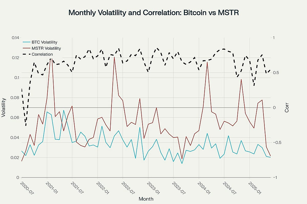 Monthly statistical analysis of volatility and correlation between Bitcoin and MSTR shows: